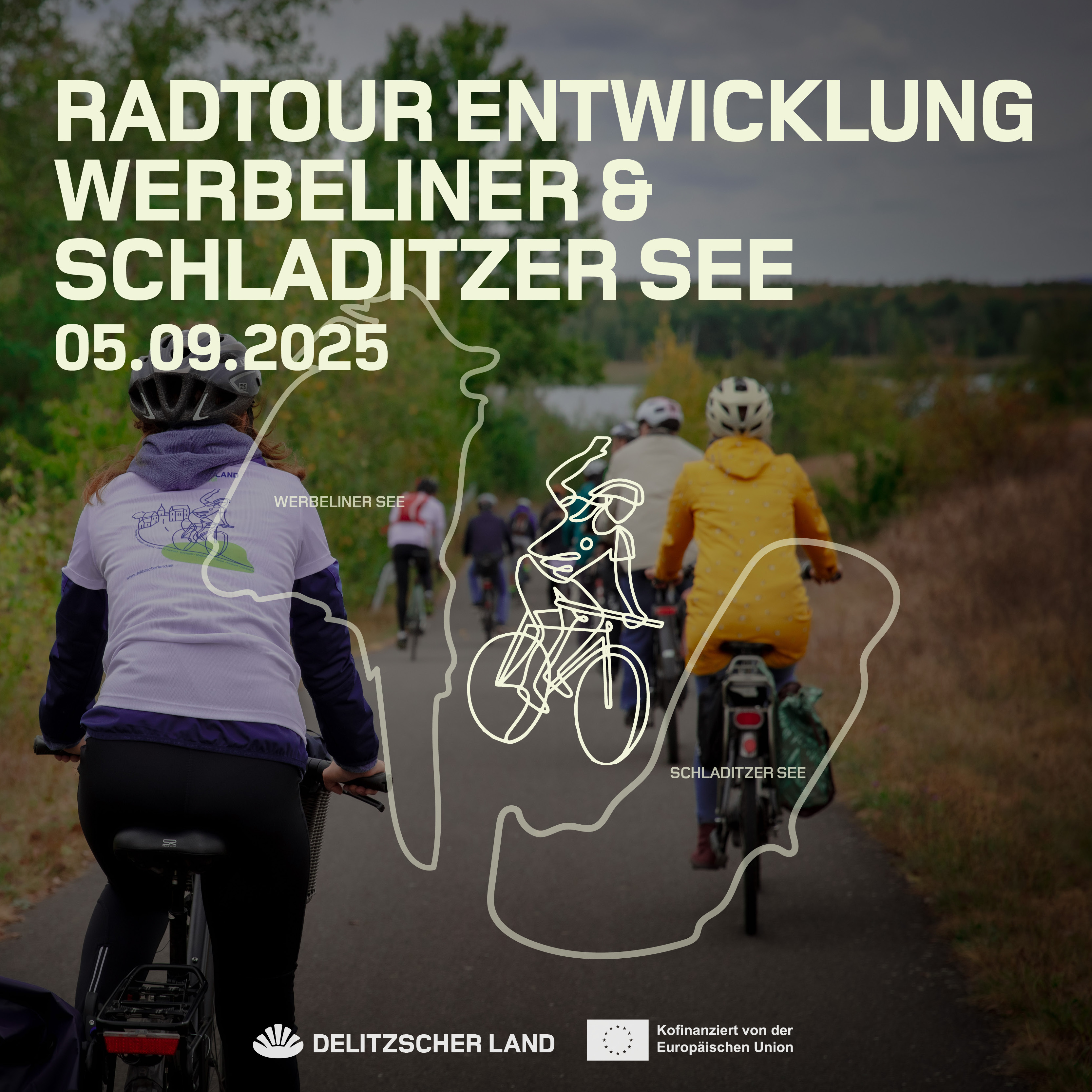 Im Rahmen des Stadtradelns im Landkreis Nordsachsen lädt der Delitzscher Land e.V. zu einer geführten Radtour unter dem Motto „Natur – Kultur – Strandleben" ein. Die rund 34 km lange Rundtour führt durch die Bergbaufolgelandschaft rund um den Werbeliner und Schladitzer See. Unterwegs erhalten die Teilnehmenden Einblicke in ökologische, touristische und kulturelle Entwicklungen sowie in die Arbeit regionaler Akteur:innen.
