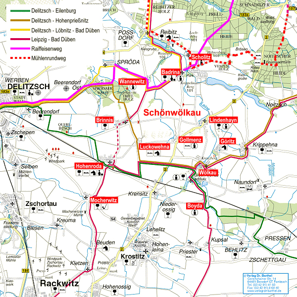 ... ist eine Fernroute vom Leipziger Stadtrand aus über Rackwitz, Mocherwitz, Hohenroda, Brinnis, Badrina, Rotes Haus nach Bad Düben. Im Gebiet der Gemeinde Schönwölkau finden Sie folgende interessante Anlaufpunkte:
